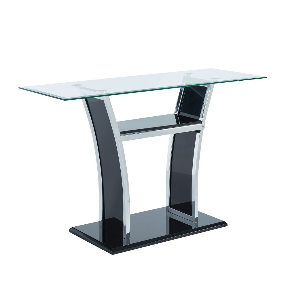 Crisp, clean lines and sleek, subtle curves blend beautifully together to form the magnificent design of this contemporary sofa table from Furniture of America. Impeccably crafted with an 8mm tempered glass top, this sophisticated and modern sofa table infuses any living space with cool, casual glamour. Vibrant chrome trim accents the curved, sweeping sides of the glossy, lacquer-coated legs, beautifully offsetting the rectangular base and rectangular beveled glass top. Available in your choice of two modern finishes of rich, glossy black or crisp, glossy white, this exquisite, contemporary sofa table is sure to bring a bold, beautiful modernity to your living room decor.